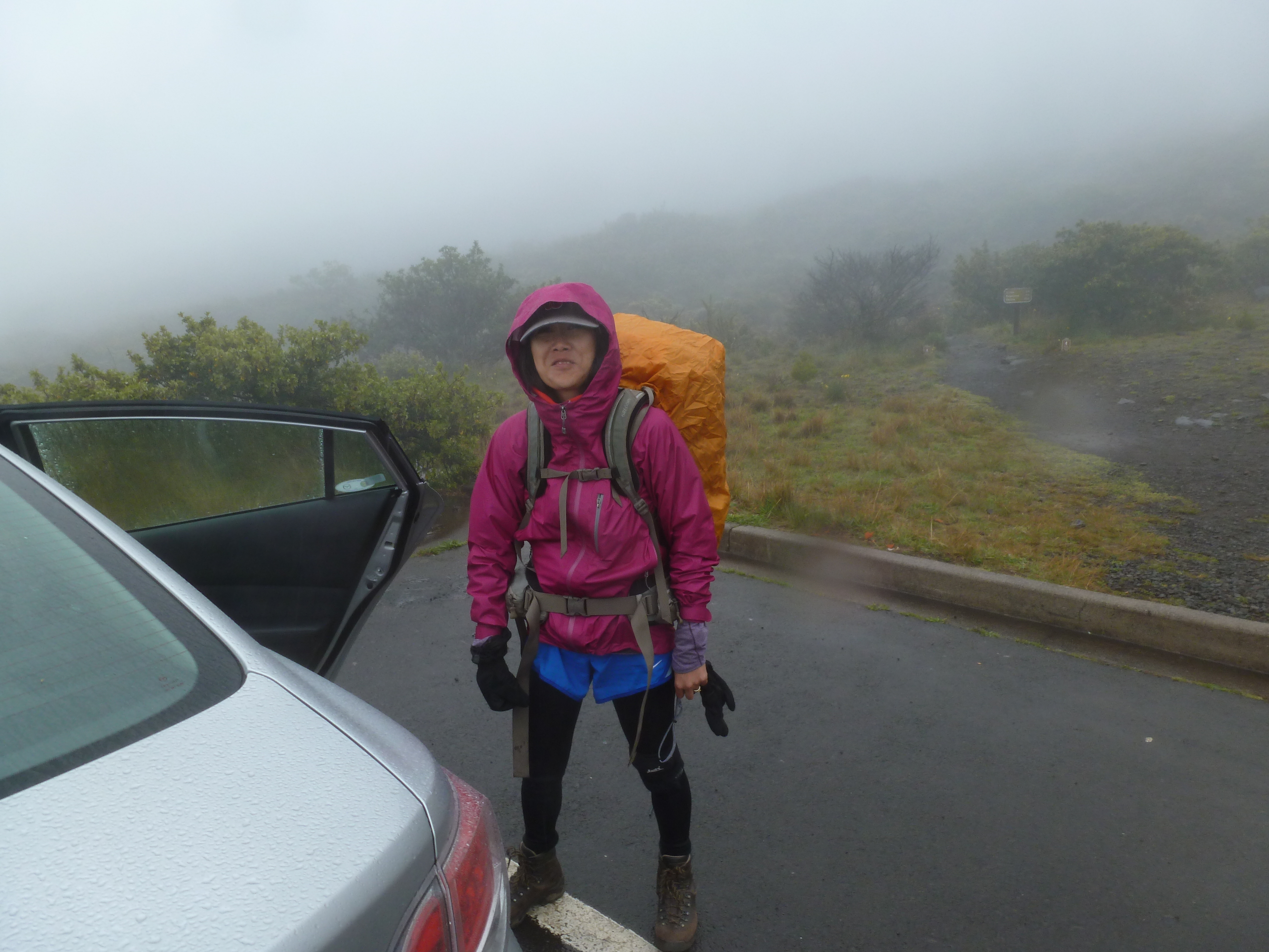 The Halemau’u Trail starts at 2435 m (7,990 ft) on the main road through the park. By the time we grabbed our gear and left our car at the parking lot, we were enveloped in a mist that brought the kind of rain that only happens as clouds try to push over 3,055 m (10,023 ft) Haleakala shield volcano. It is so large that it takes up 75% of the land area of Maui and dictates the weather for most of the island.