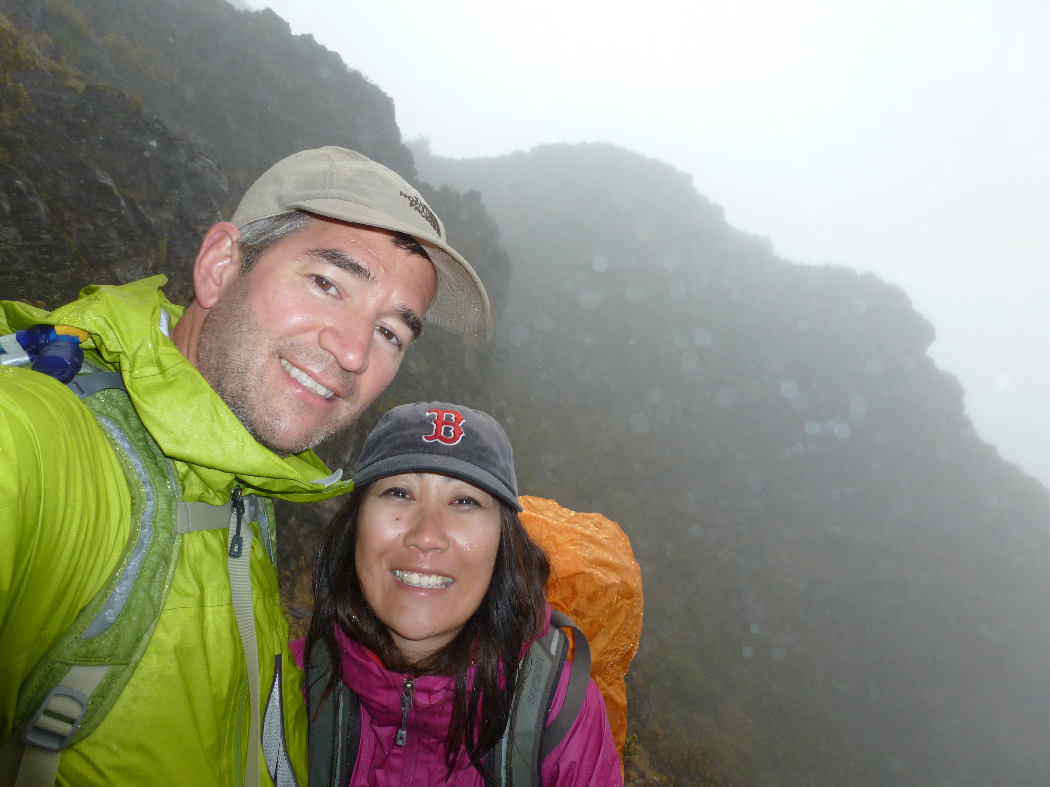 At 6,380 feet (1,945m), Paliku is located on the east end of a beautiful valley at the base of a rain forest cliff. We were very happy to arrive and quickly looked for a campsite. Unfortunately, just as we began to unpack, the rain started coming down very hard and the inside of our mostly-screen tent was soaked before we could cover it with the rainfly. Jeanne spent the next several minutes drying the tent floor as best she could, but the damage was done and we would have a wet tent for the the night. We spent the next two hours eating salami, our dried mangos and sunflower seeds. Darkness arrived at 7pm, and we were fast asleep minutes later.