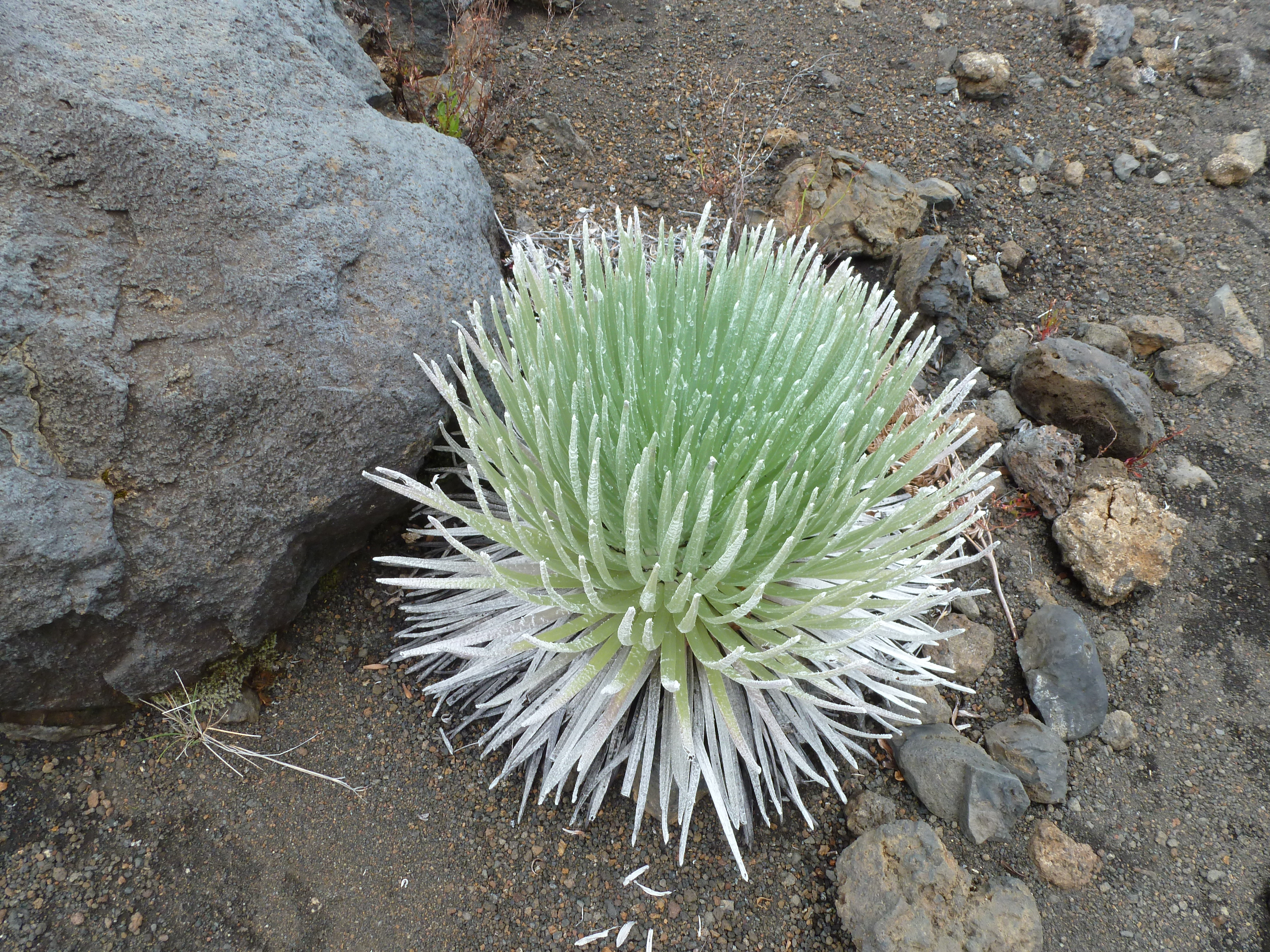 The landscape of the center section of our hike could best be described as lunar. We made our way around several cinder cones that looked like they could have erupted just recently, though we knew that not to be true. Lacking water in the rain shadow of the Crater’s walls, erosion takes place very slowly without vegetation to help break down the rock. In fact, one of the only plants is the silversword, unique to this location and possibly one of the hardiest plants on the planet.