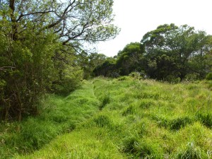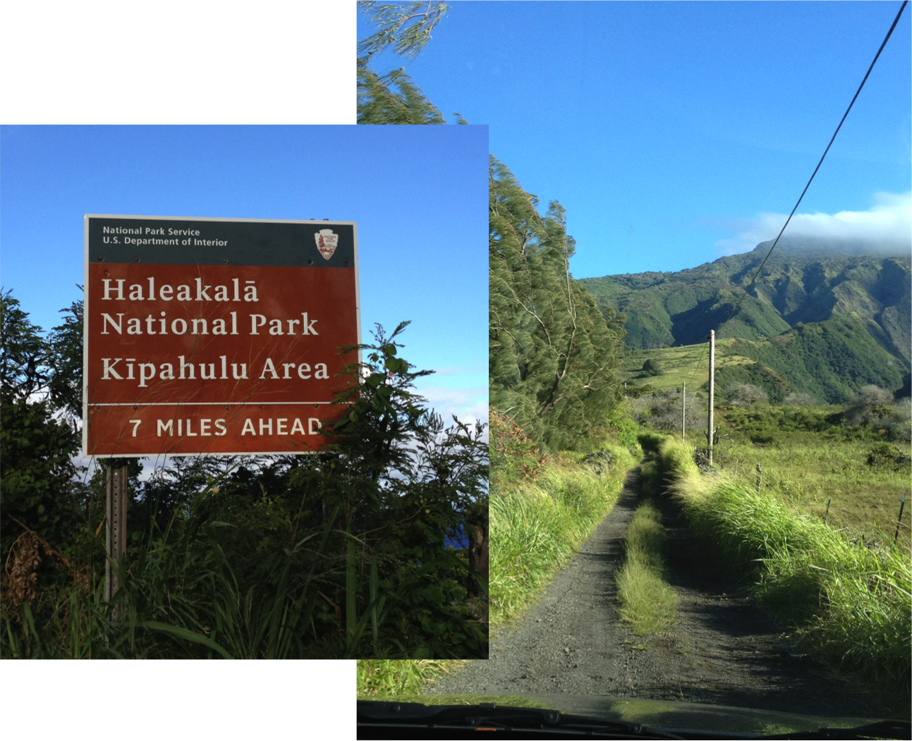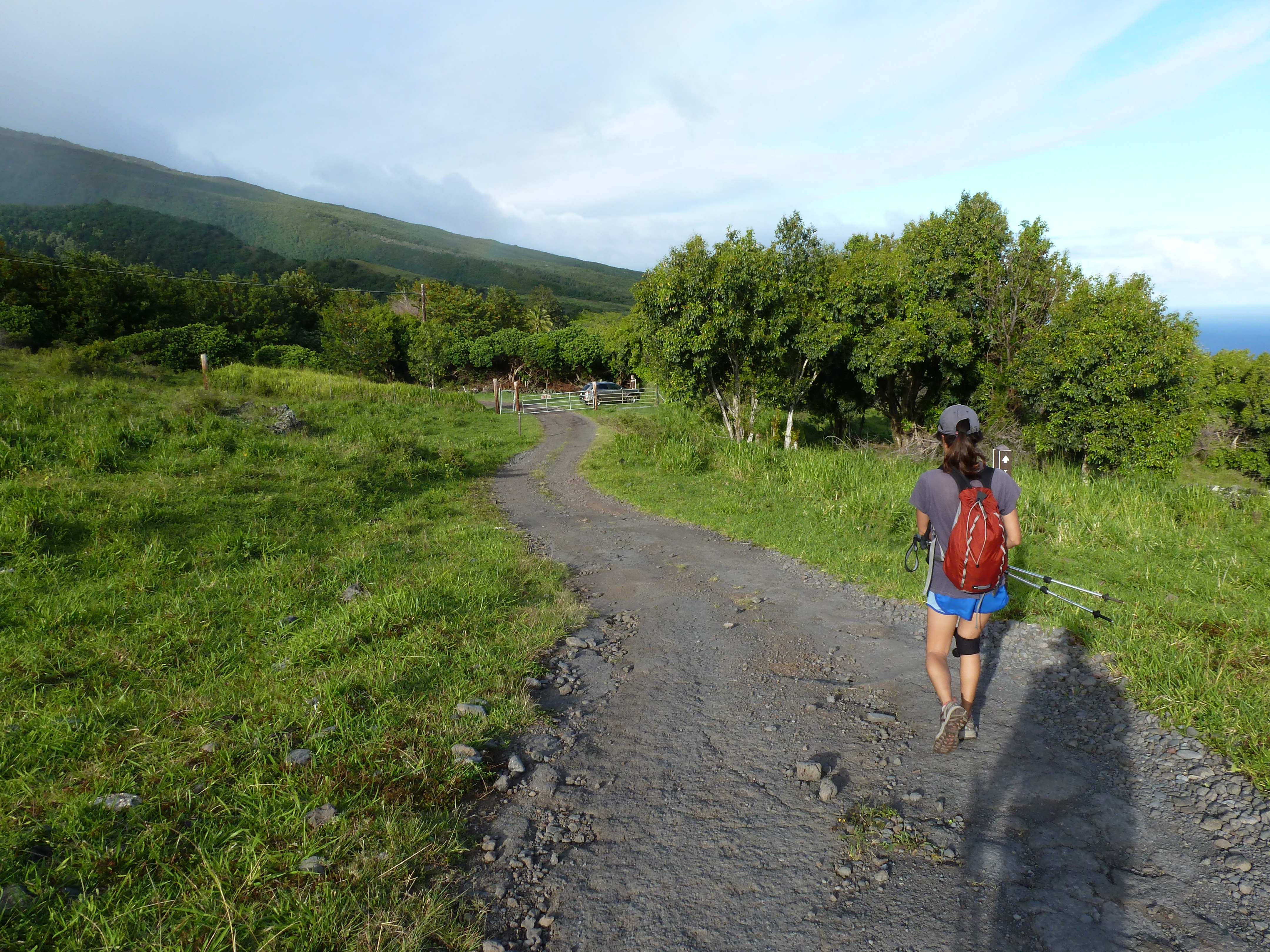 At the end of this isolated section and about 100 m before the Kaupo Store (and immediately to the right of the Haleakala National Park sign that you’ll need to see in your mirror, as it faces the other way), is the road that takes you to the trailhead itself. If you thought the road to get this far was rough, wait until you see the final stretch of narrow, broken pavement with tall grass growing in the center that leads to the trailhead.
