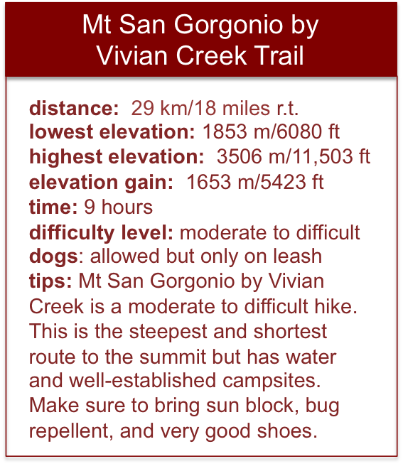 Mt San Gorgonio’s Vivian Creek is one of the easier trailheads to reach. From the Mill Creek Work Site, continue to follow Highway 38 to Forest Falls Road. Turn right and follow Forest Falls until it ends at a picnic area (which is obviously a former campground). The trail starts immediately off the end of the parking lot and initially follows the left bank of the rocky stream bed that you’ve been following since turning on Forest Falls.