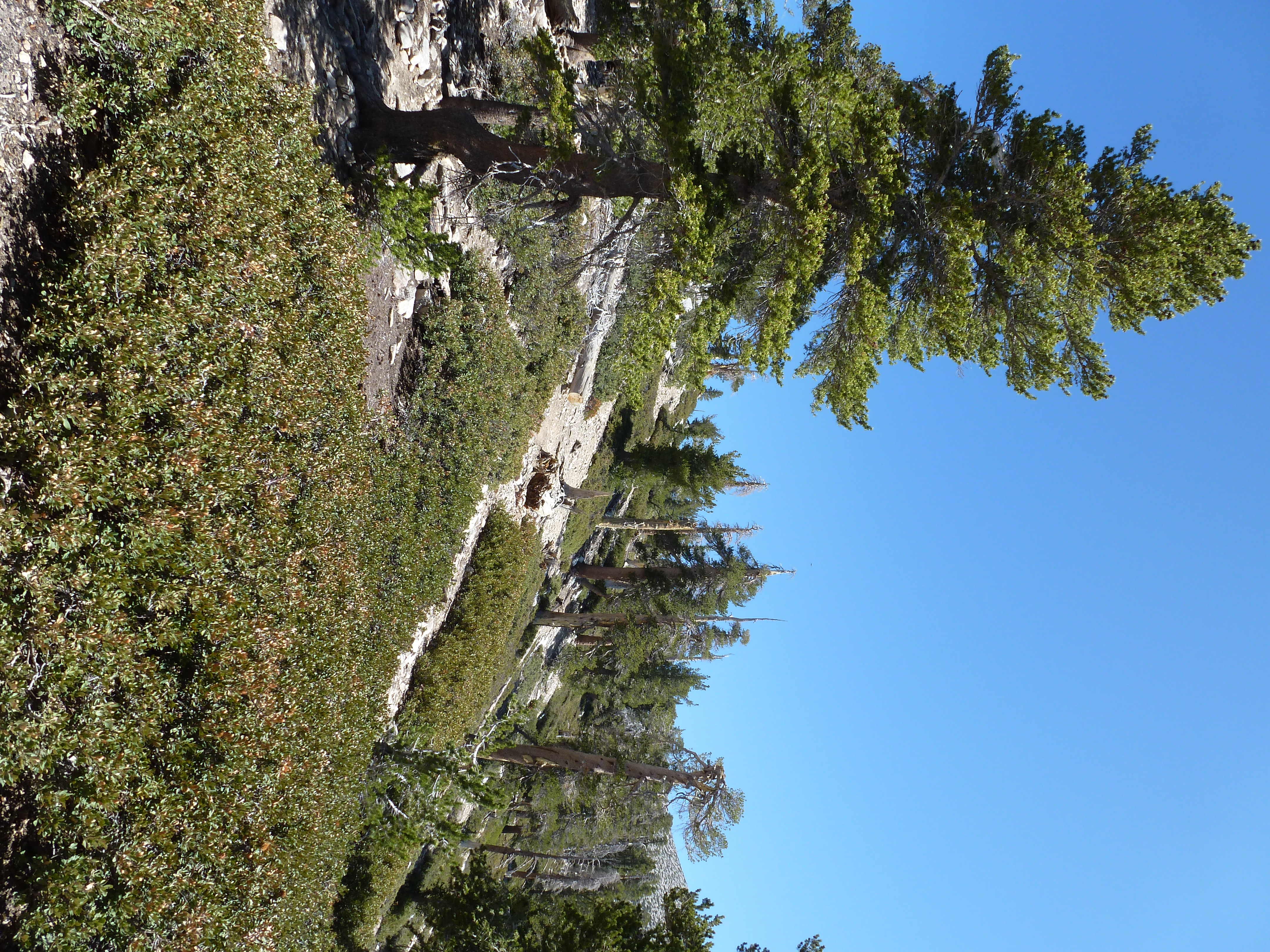 - High Creek at 8.5 km (5.3 miles) and 2804 m (9200 ft) and last water. High Creek is in tall pines but less wooded than the lower campsites.