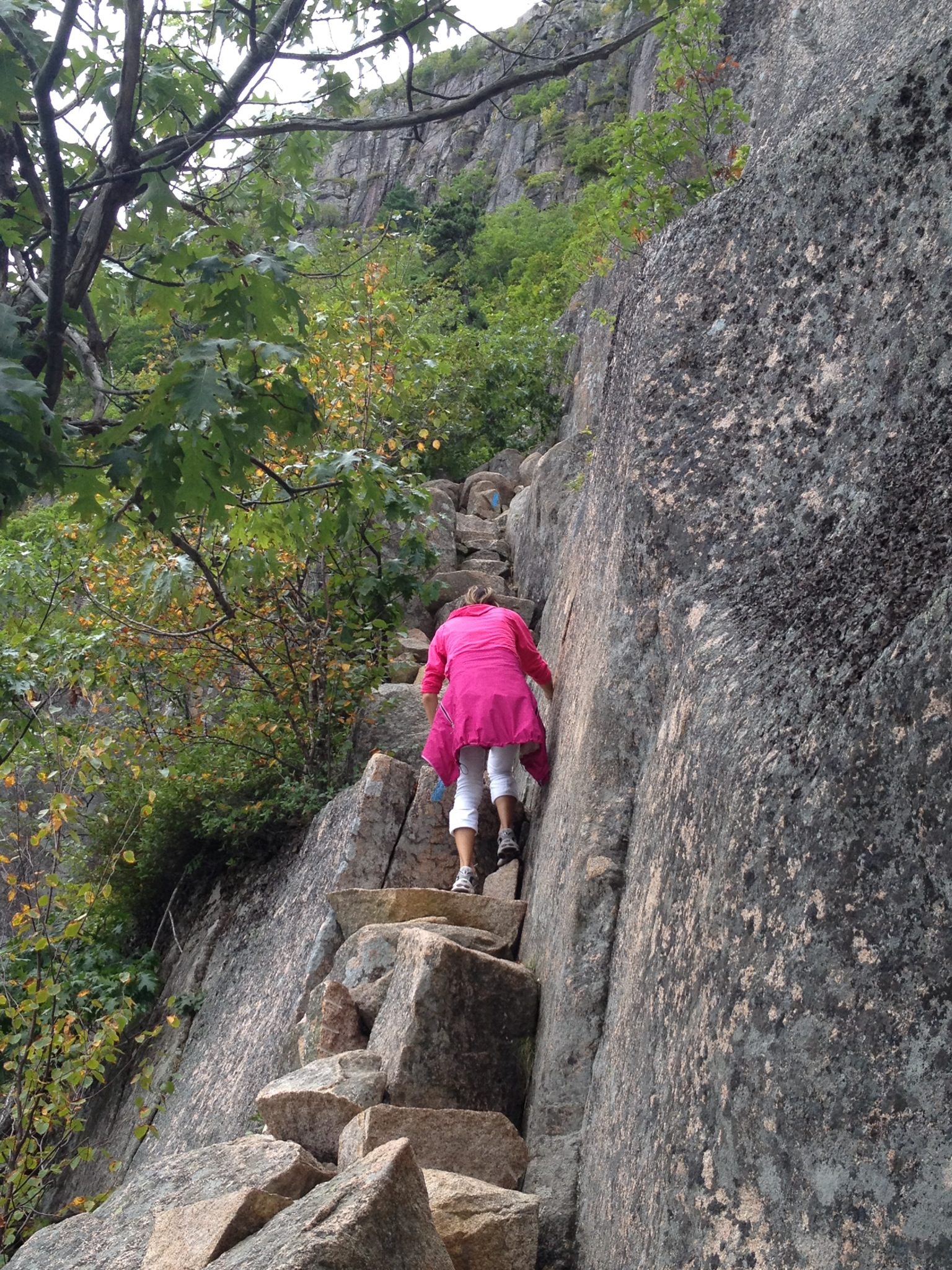 On a whim, we decided to hike the short-but-difficult Precipice Trail. The trail begins at a parking lot along the Park Loop Road and immediately earns its name by winding up the nearly vertical face of Champlain Mountain.