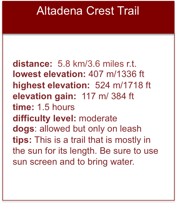 This isn’t a long hike but is very convenient to Altadena and Pasadena. The loop can involve coming back on the roads or doubling back on the trail, depending on your tastes.