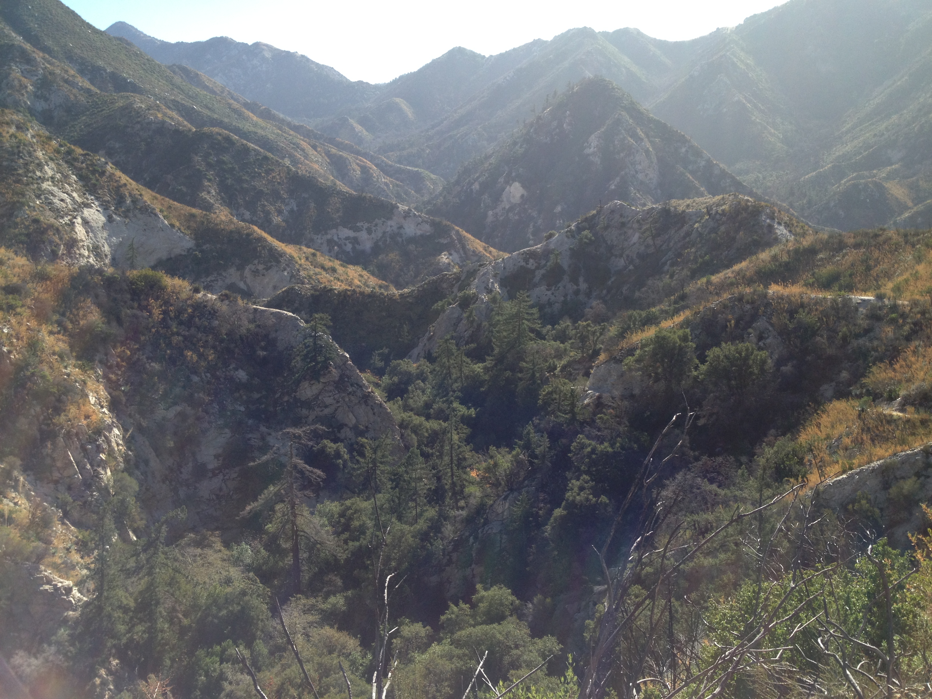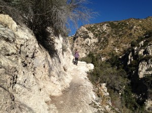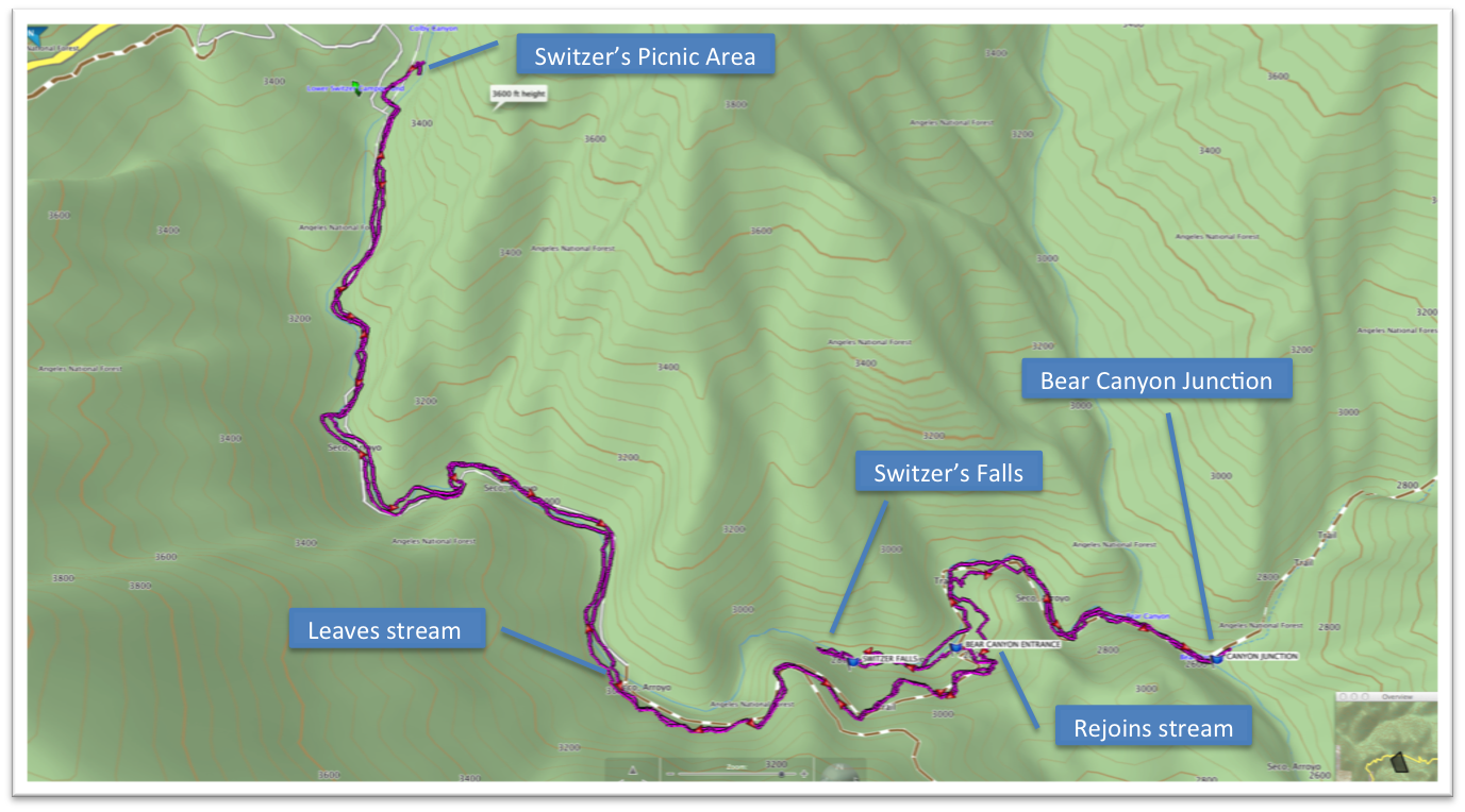 The first section is wide and follows an old road to the historic Switzer’s Camp. Once past the camp, it becomes a normal San Gabriel Mountain trail and leaves the stream bed to climb the hill on the right bank. This is to avoid the series of waterfalls that would otherwise block access to the lower reaches of the canyon. This section has some exposure but the trail is wide and safe.